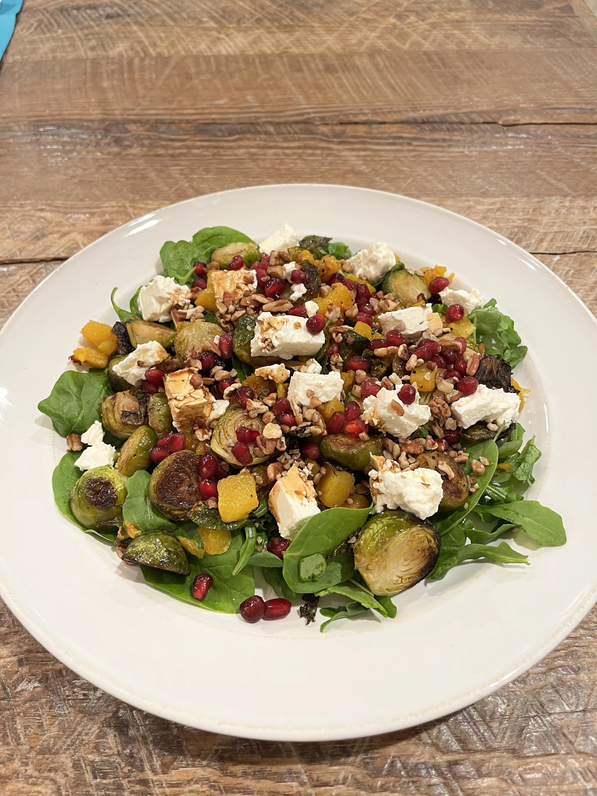 Place greens on plate, add oven roasted veggies, then top with feta cubes, pomegranate seeds, and pecans