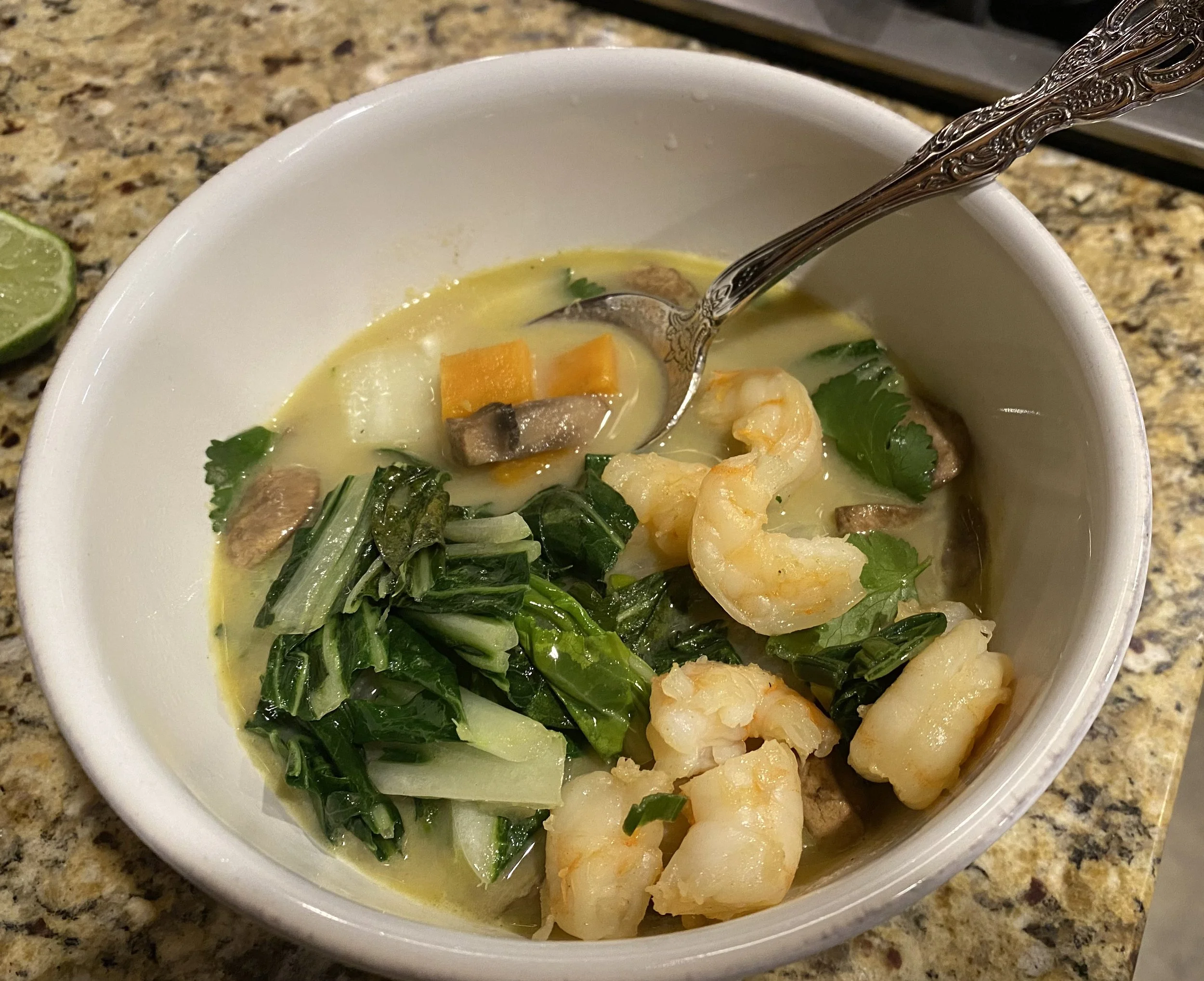 (Ingredients- thai green curry paste, low sodium chicken broth, canned coconut milk, lime, shrimp, mushrooms, bok choy, squash, zucchini, sweet potato, red pepper flakes)