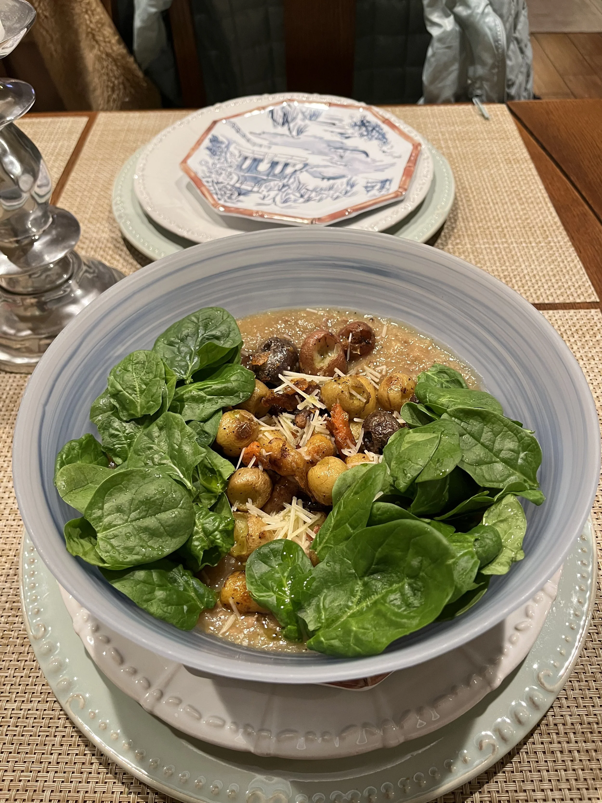 Top soup with oven-roasted potatoes and carrots, baby spinach, crumbled feta or shredded parmesan cheese, and a big squeeze of lemon